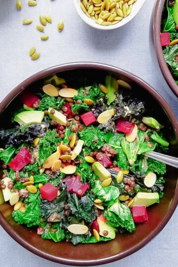Roasted Beet, Kale and Lentil Salad with Golden Dressing, Avocado, Toasted Almonds and Pepitas