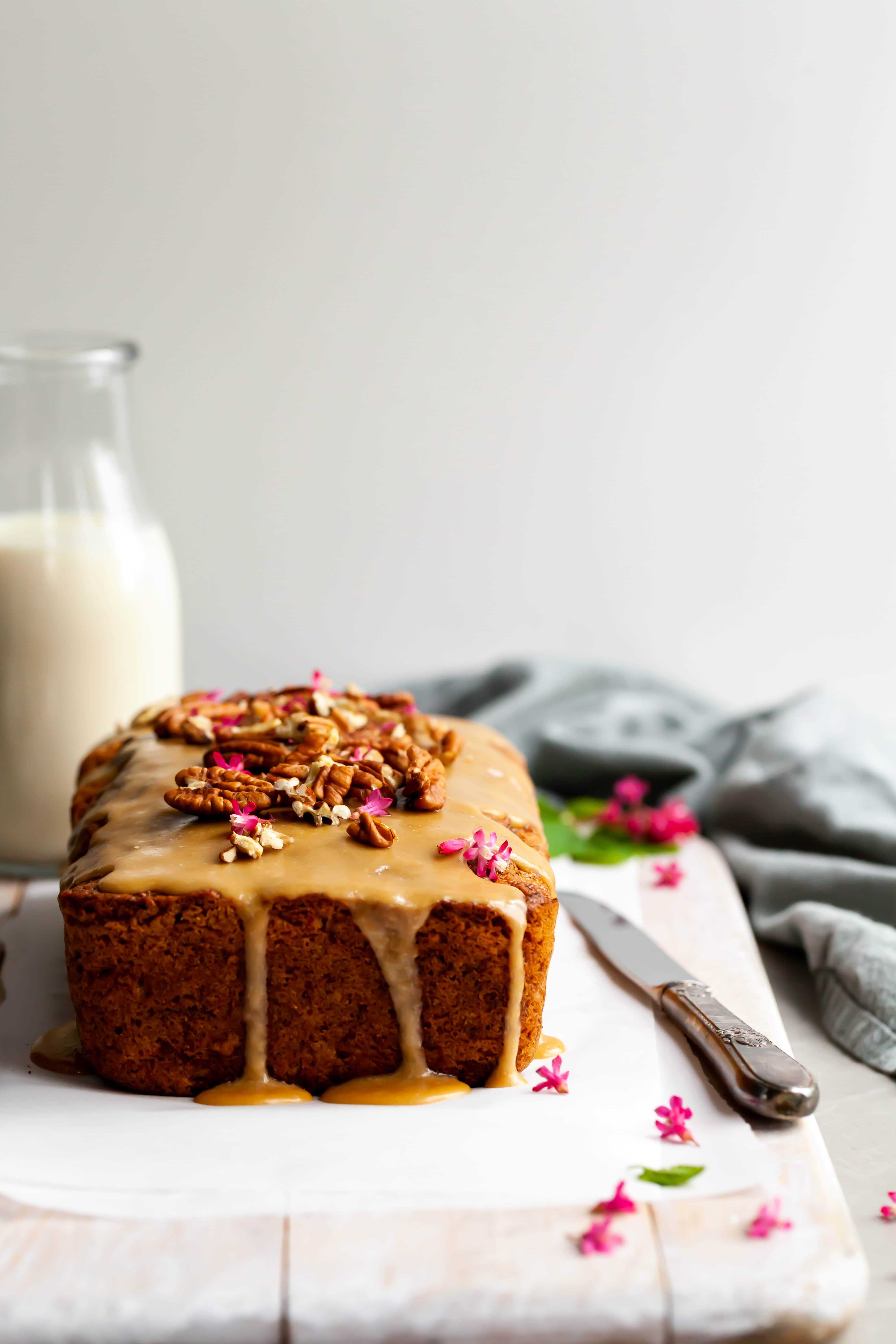 This is an Easter Bunny approved Vegan Carrot Spice Loaf with Maple Glaze. A lovely moist carrot loaf made fragrant with warm spices, and a bit indulgent with a smooth maple glaze.