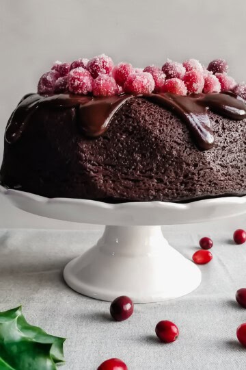 Cranberry Chocolate Fudge Bundt Cake with Chocolate Ganache & Sugared Cranberries