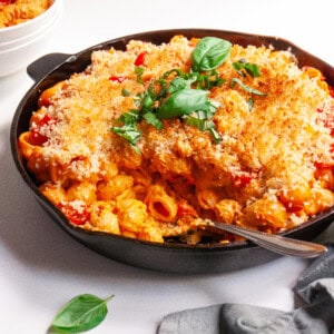 Comforting noodles swimming in a creamy, savory and nutritious sauce studded with roasted tomatoes and topped with a crispy "buttery" breadcrumb topping. We're blending ready-made Romesco or Marinara sauce with a creamy cashew base to bump up the nutrients and to get things extra lush, which also means this meal comes together in a snap!