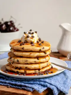 Fluffy and delicious with light tones of cinnamon and vanilla, and studded with mini chocolate chips, these pancakes are perfect for breakfast or breakfast for supper!