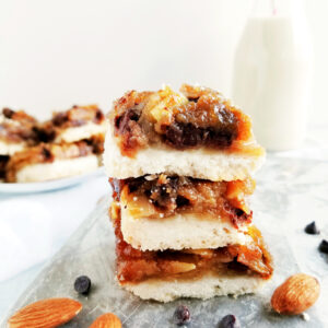 These sweet treats have been veganized, made into squares, and have chocolate and almonds in them instead of raisins. And no shade on raisins, but almond and chocolate are so lovely in pastry. Added bonus: the base is a melt-in-your-mouth shortbread. If you prefer raisins, go for it, just substitute them for the almonds and/or chocolate.