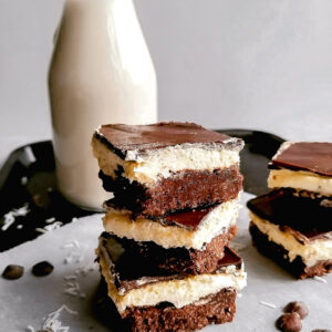 These squares are rich, sinful, and delicious. They also come together easily, with most of your time being spent waiting while they chill which means you can, too! Sitting on top of the chocolate coconut crumb base is a sweet custard layer which is finished with a silky chocolate ganache. These taste the same as the non-vegan original and no one will miss the dairy or eggs! Vegan sweetie for the win!