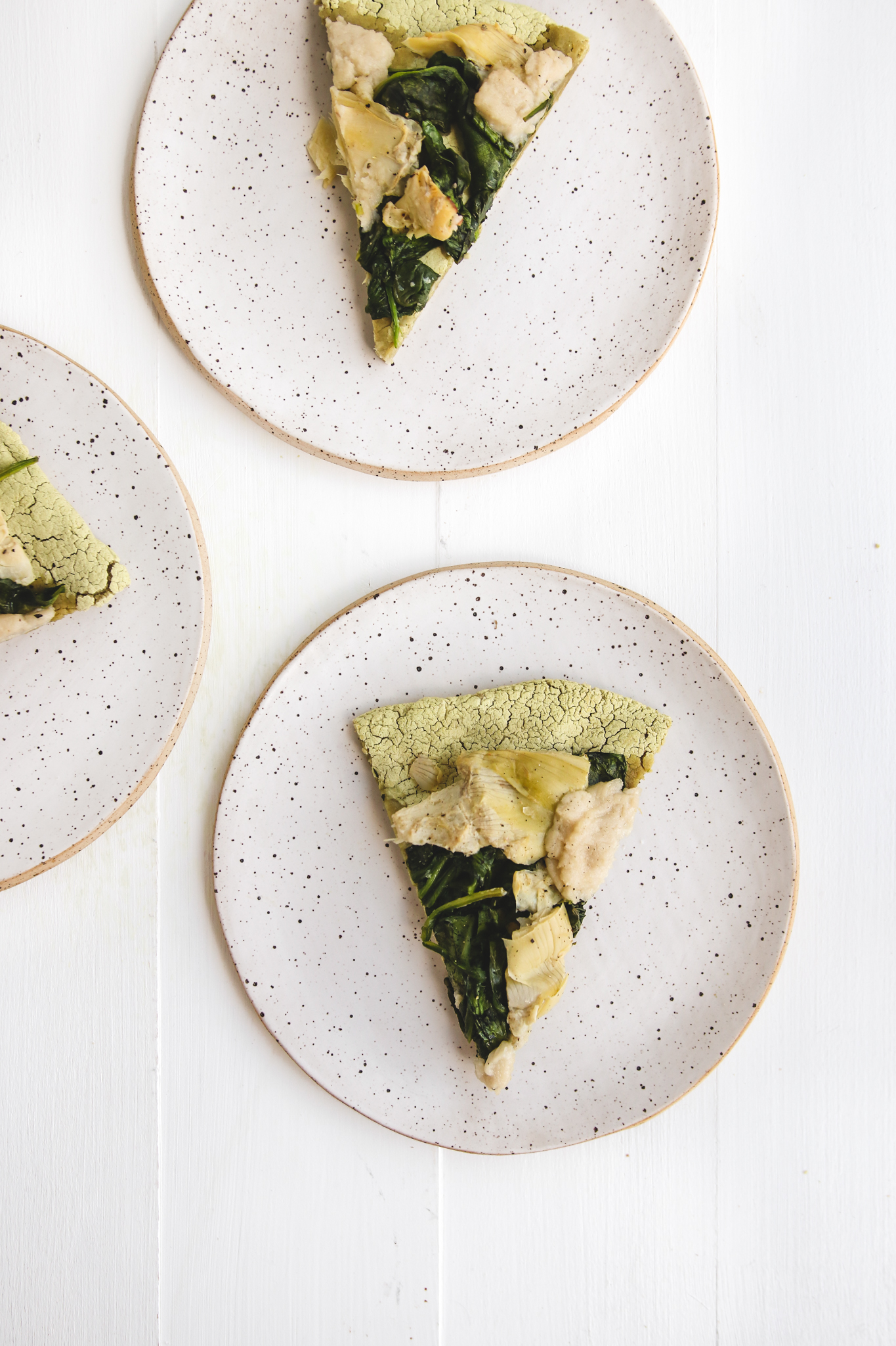 “A quick and simple white pizza that’s pantry friendly and gets the veggies in too! This Vegan Spinach Artichoke Pizza is made with a yeast-free, buckwheat flour crust, artichoke hearts, garlicky spinach and vegan mozzarella.“