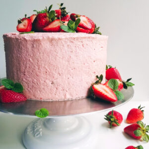 - Place a small dollop of frosting on the serving plate to prevent the cake from sliding around. Place one cake layer on the plate and evenly cover with frosting. Try using an ice cream scoop, using 2-3 scoops of frosting in between each layer. This helps ensure even amounts of frosting between each layer which is apparent once the cake is cut. Repeat for the second layer. Use the same number of scoops for the top layer but work it down the sides of the cake as well – the frosting will be very thin – you’re creating a crumb coat. This traps the cake crumbs so that they don’t get caught in the final frosting layer which can appear a bit messy. Chill the cake in the fridge for about an hour, then apply the final frosting to the top and sides of the cake, smoothing out with an offset spatula or cake scraper. You may not need all of the frosting. Top with fresh strawberries. Cover leftover cake with plastic wrap and store in the fridge.